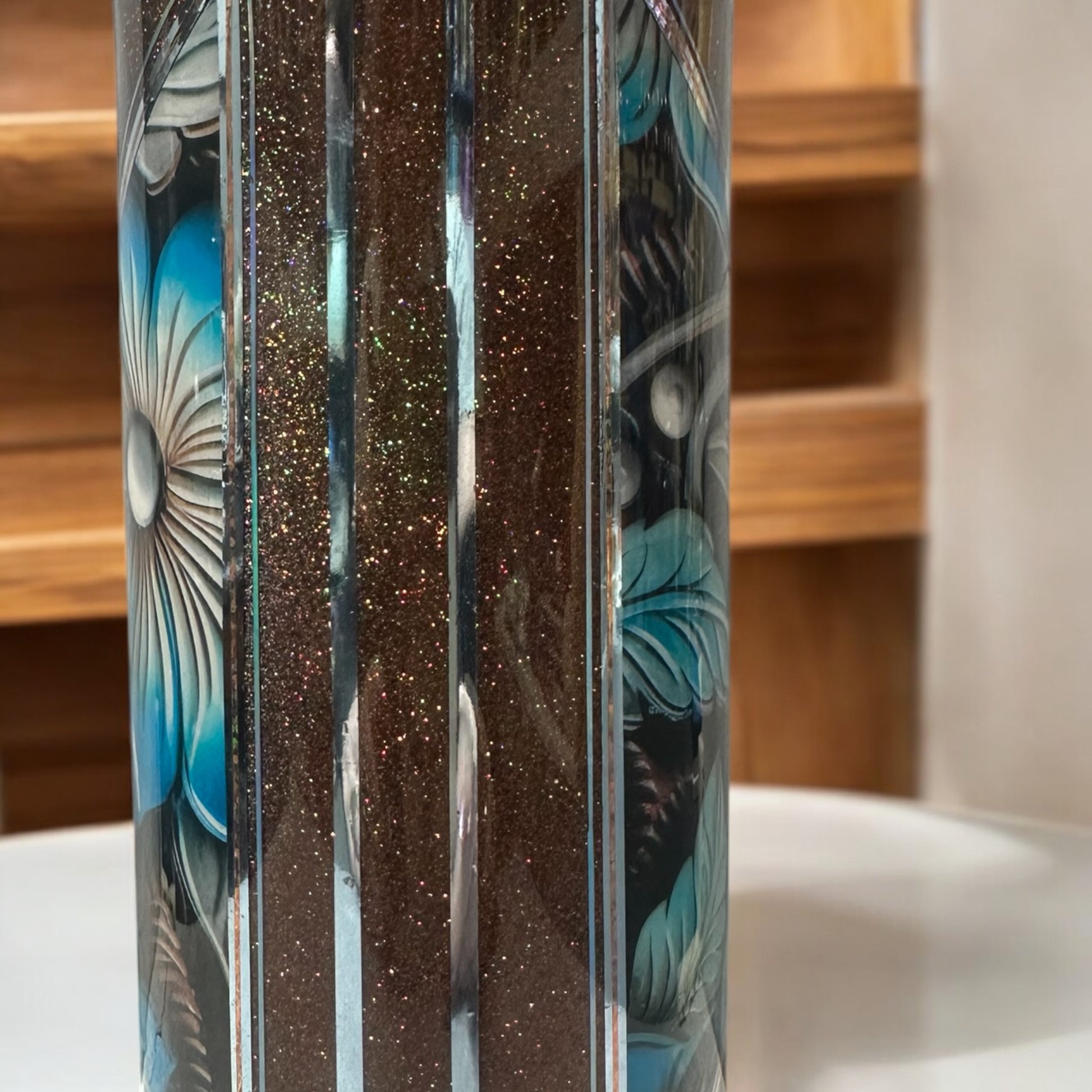 This 25 oz tumbler features a unique duo design, with a bold leopard print and delicate flowers. The resin cover ensures insulation, keeping drinks at the desired temperature. Easy to clean with hand washing only. Stay stylish and hydrated with this tumbler.